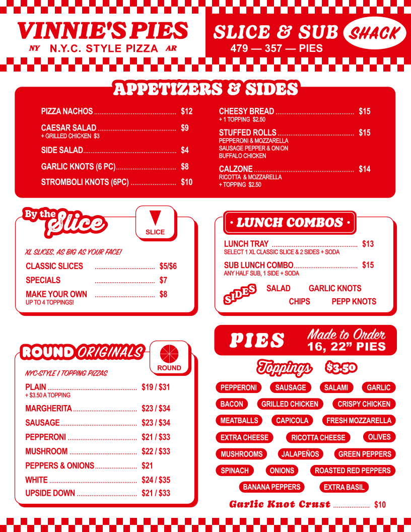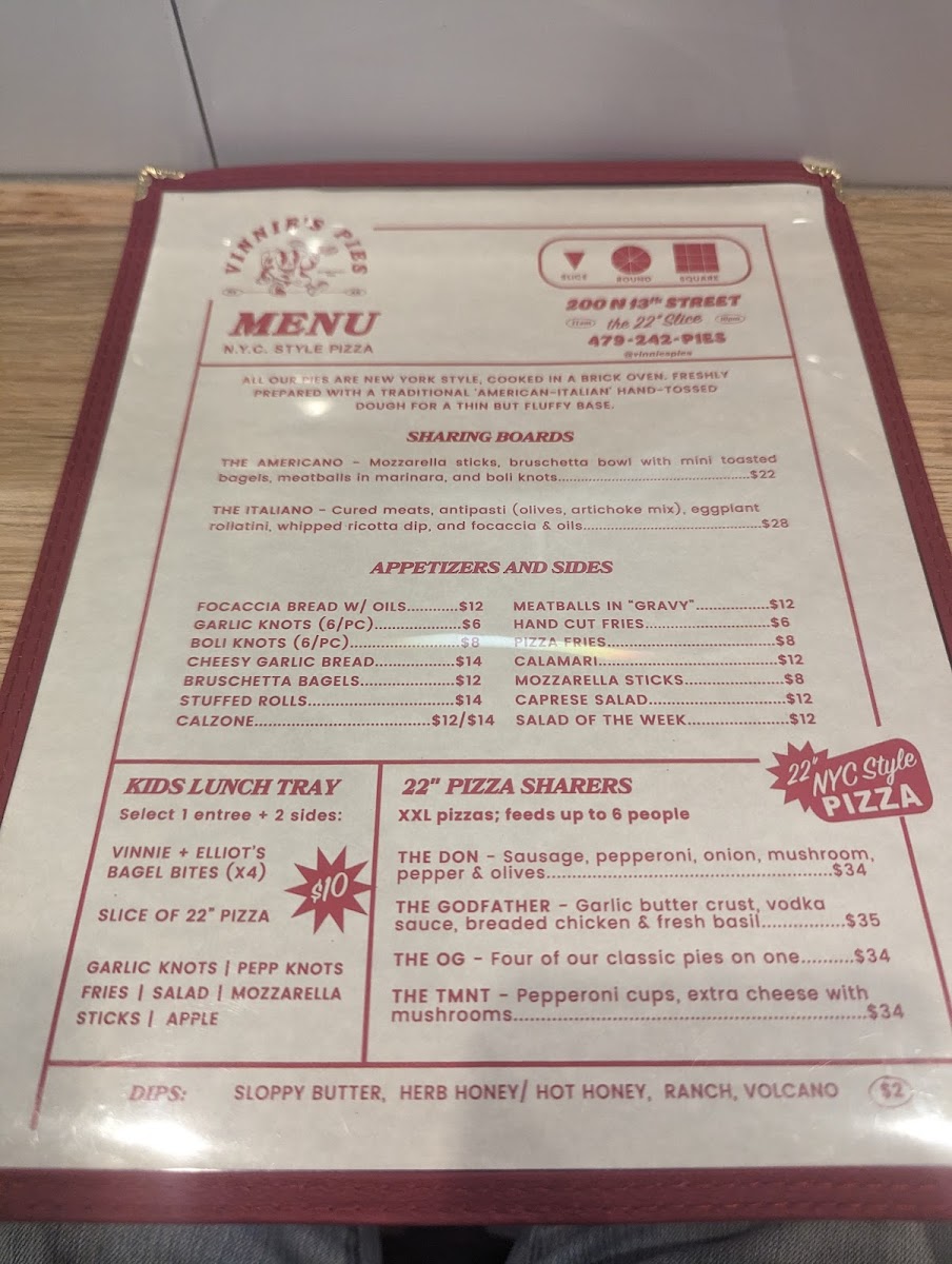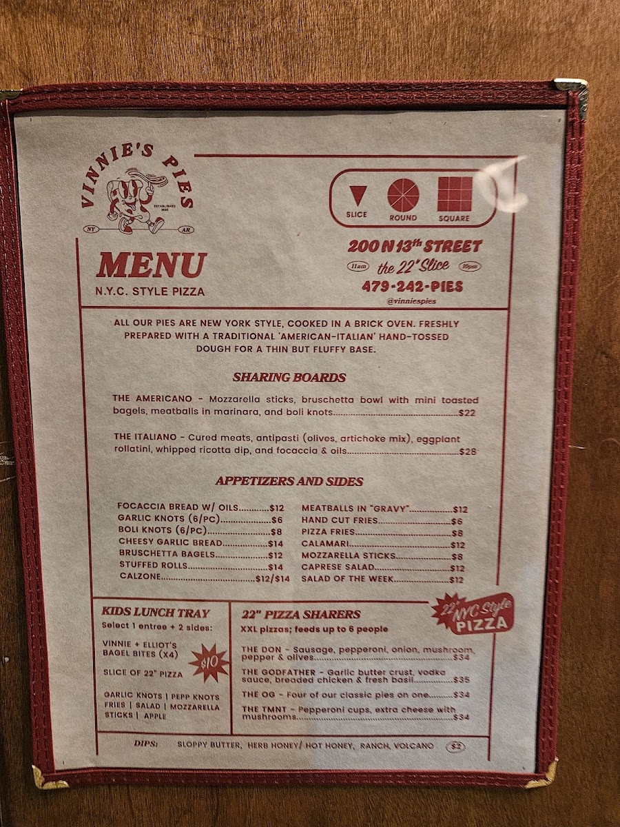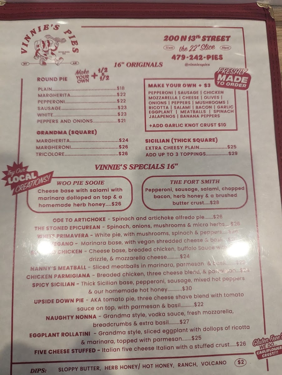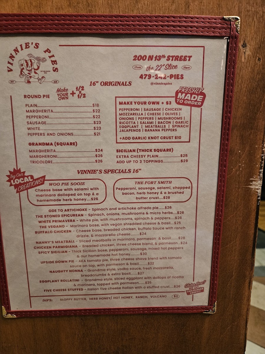 Welcome to Vinnie’s Pies, a beloved new pizza haven at 200 N 13th St, Fort Smith, AR. Here, culinary passion meets warm hospitality, creating a delightful dining experience for guests of all ages. The menu features a range of mouthwatering pizzas, with highlights including the Margherita and Buffalo Chicken varieties, known for their perfect balance of sauce and cheese, and fresh ingredients like basil that elevate every bite.